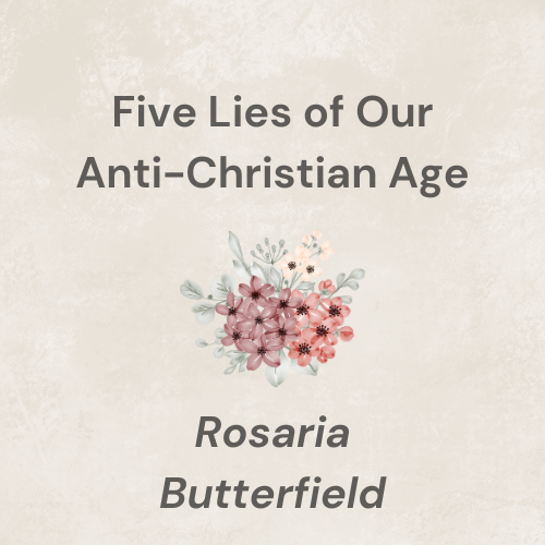 Topic | The study will be based on Rosaria Butterfield’s book, Five Lies of Our Anti-Christian Age. “Think of the snake in the garden of Eden, merely suggesting that God’s word might not be fully trustworthy.”